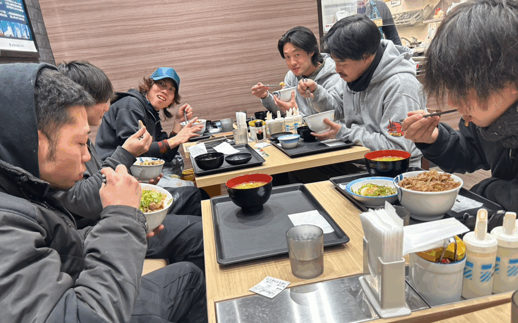 毎日夜遅くまで駐車場に響く笑い声と声援。遊んでいる時もあれば、 塗装や左官の練習をしているときもあります。家族のように距離が近く、 何でも話せる仲間と汗水垂らして一生懸命現場に励む姿は、青春さながら。 そんな仲間と食べる夜間作業終わりの牛丼。最高ですよ。