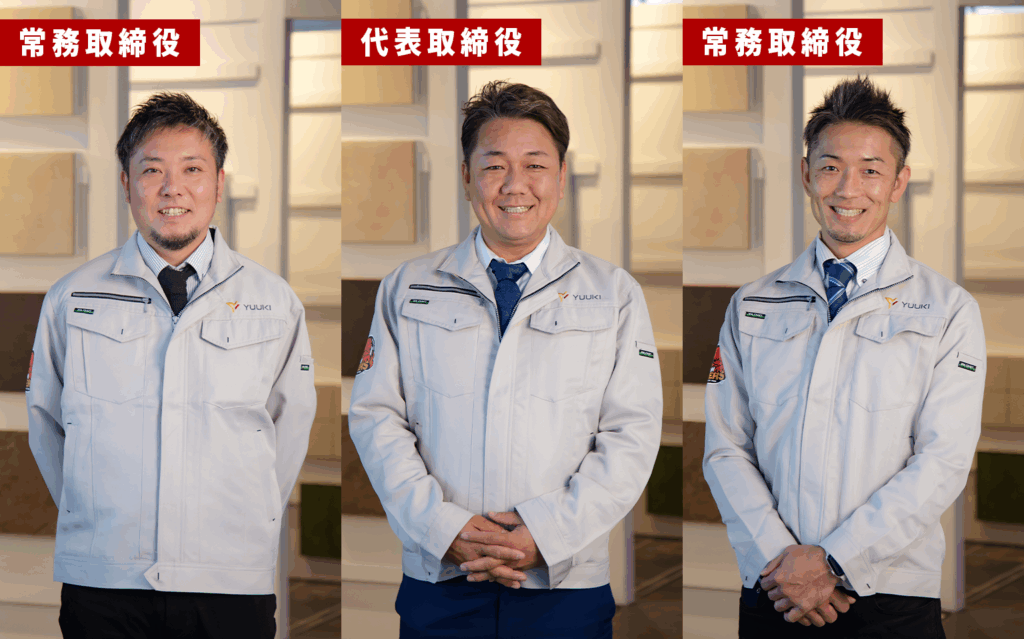 技術も、行動も、思考も、想いも。社長と2人の常務がゆうき総業の屋台骨。 塗装も左官も防水も、時代の変化に合わせて業態は変わるかもしれません。 それでも、3人が集う場所が【ゆうき総業】であることは変わりません。絶大なる信頼と最大の敬意を込めて、“あの人たち、バケモノだよね”。